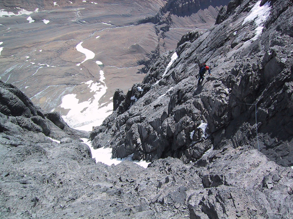 Negotiating the startlingly exposed traverse through the yellow cliff band. |