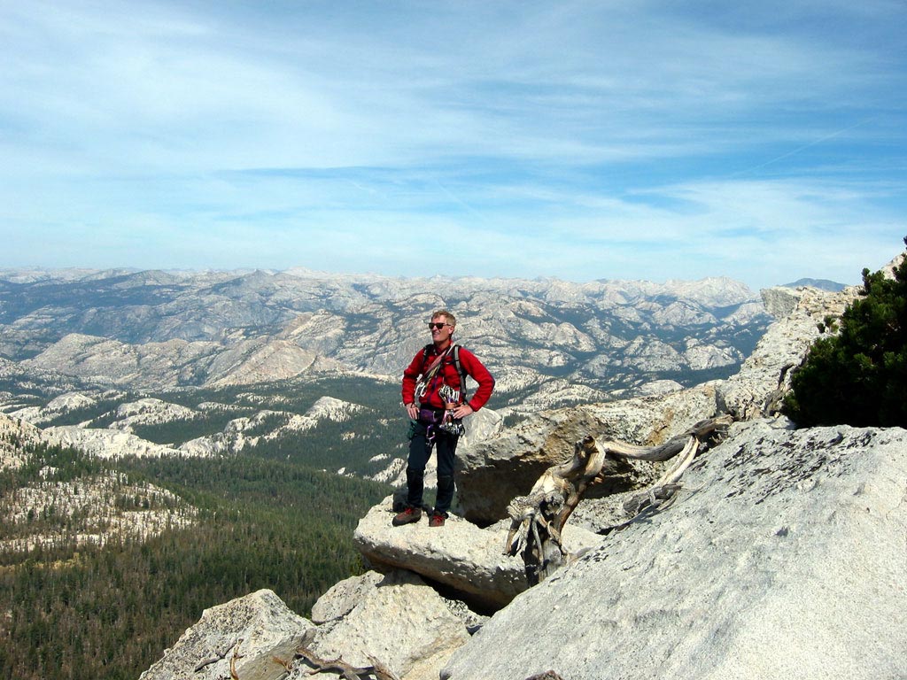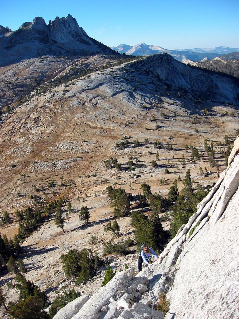 A secure belay spot, looking east toward Tuolumne Meadows and Mt. Conness |
