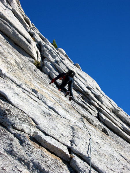 Above the chimney variations are also plentiful. Here the leader heads left toward the big dihedral that runs straight up toward the summit. An excellent pitch. |