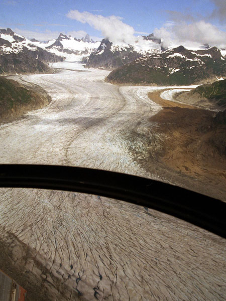 Devil's Thumb from the air. Note the 3000' granite slabs that form the base of the massif. |