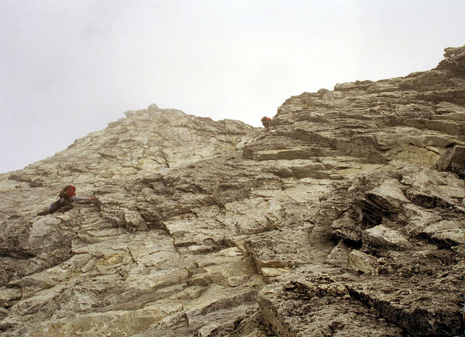 On the second attempt, the team climbing the SE Face. The top of the second step forms the right side of the prominent, rightmost notch, and the "prominent gendarme" is visible through the clouds above the climbers. |