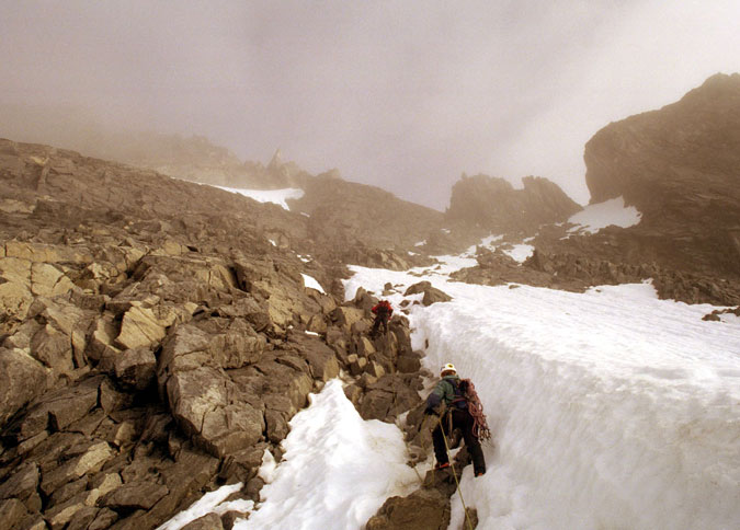 After four rappels from the notch, on the "Hog's Back" descending to the bergschrund. |
