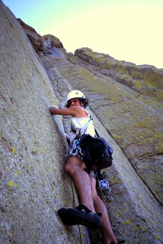 The west side of Devil's Tower. El Matador goes up the chimney that forms the longest shadow near the left side of the tower, then steps left to share a pitch with the McCarthy West Face route. Jam cracks through a roof are involved in the finish, for which there are several variations. |