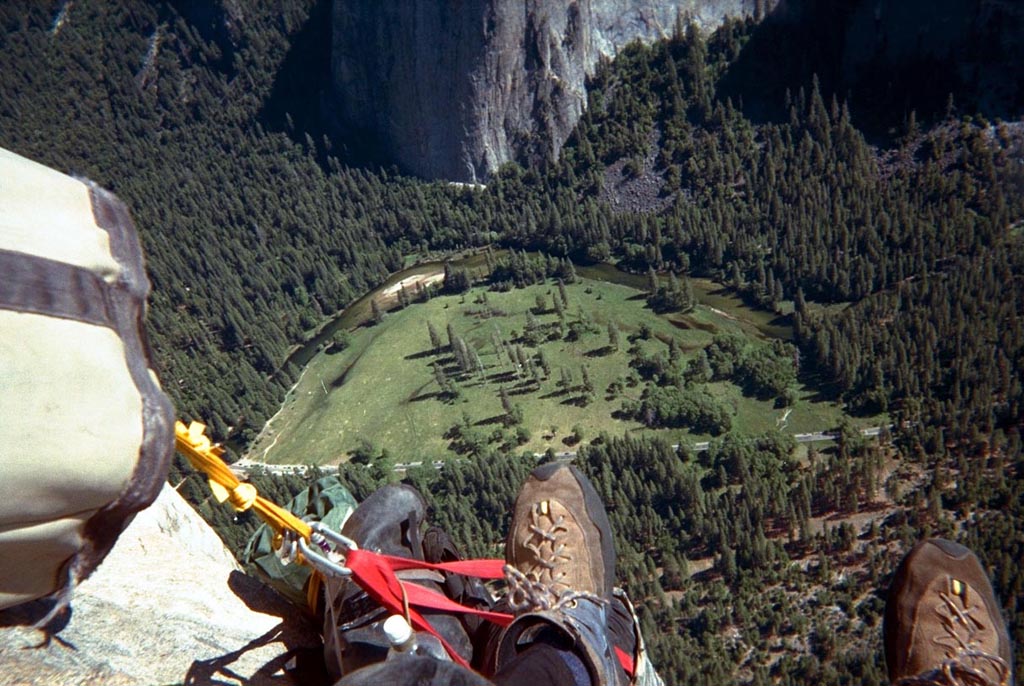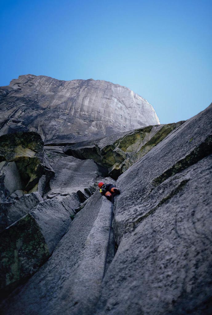 Leading pitch 31, the 95 degree headwall - flaring cracks in an otherwise blank stretch of overhanging granite. |