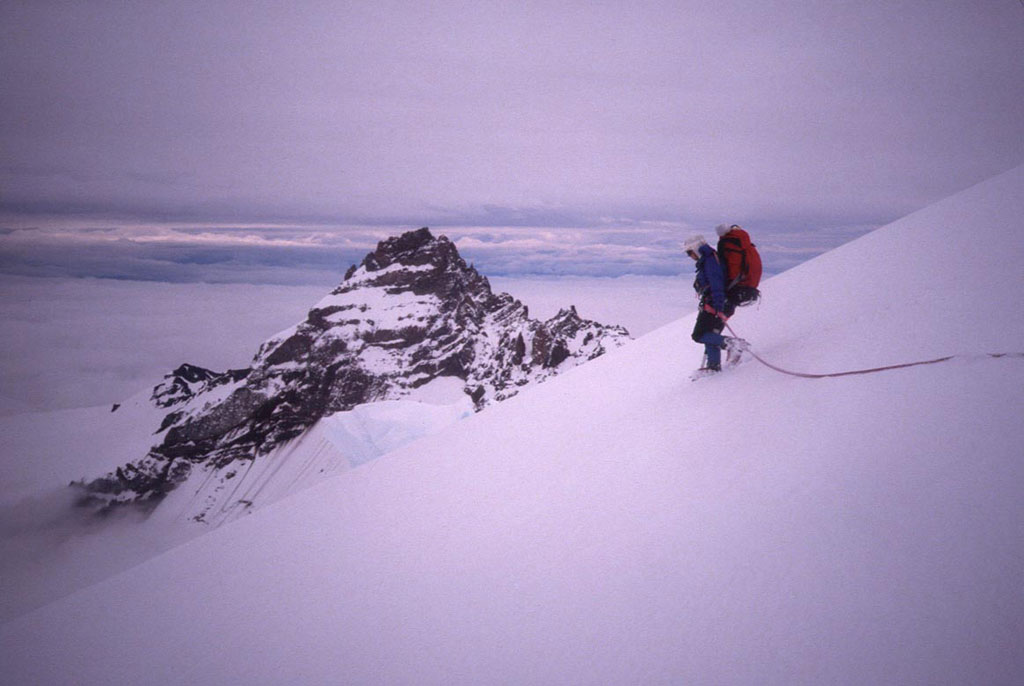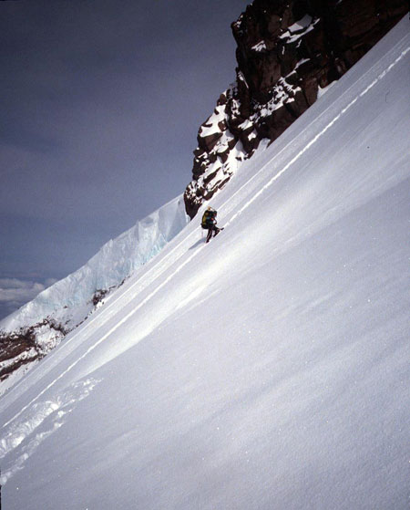 Another party at 13,000' (3960m.) Shows the angle, which is shallower here than below or above. |