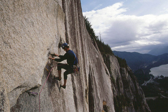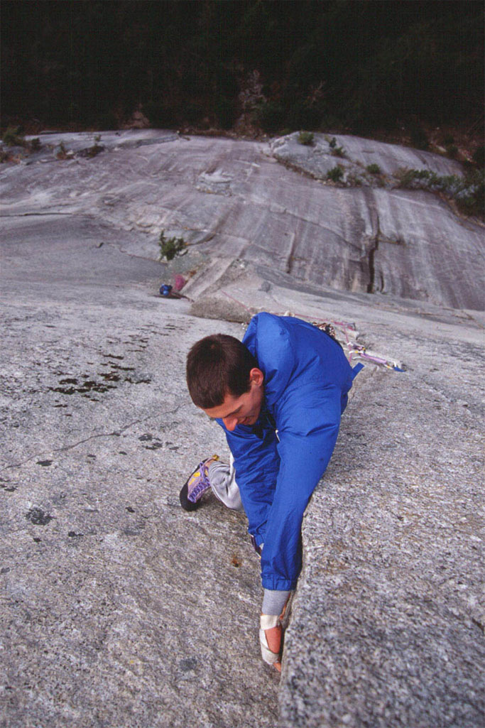 Climbing Apron Strings, one of the variations that leads up the lower-angled slabs from the base. |