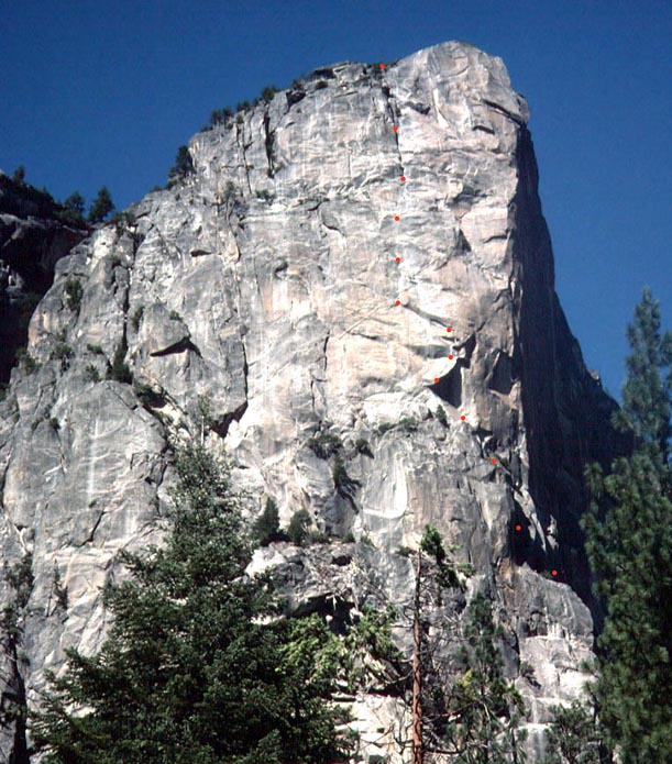 Washington Column S. Face from the Valley Floor, with the route marked. |