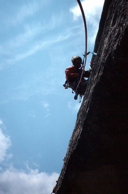 Leading pitch 7 on the clean upper headwall. |
