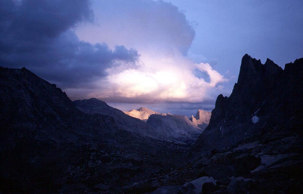 Sunset over the Cirque of Towers from camp at the base of Wolf's Head. The peak on the right is Warbonnet. |